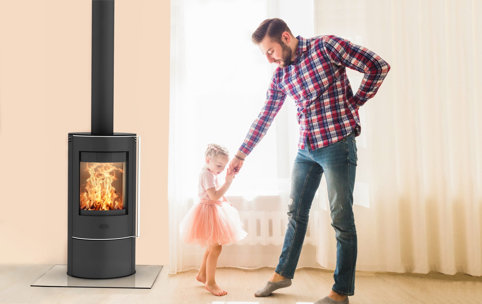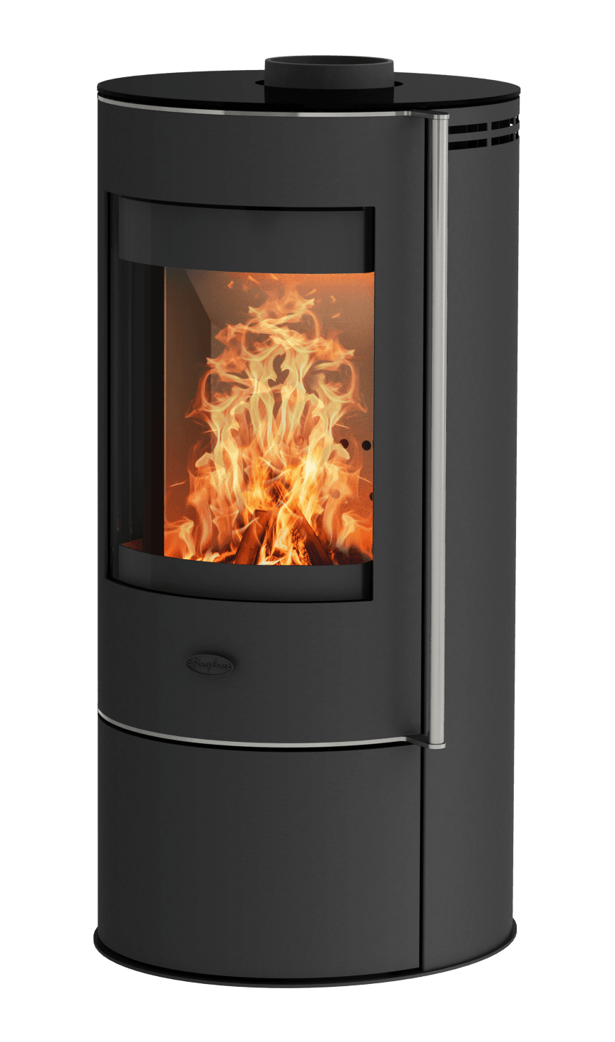 Det store, buede glassvinduet lar deg nyte det koselige flammebildet.