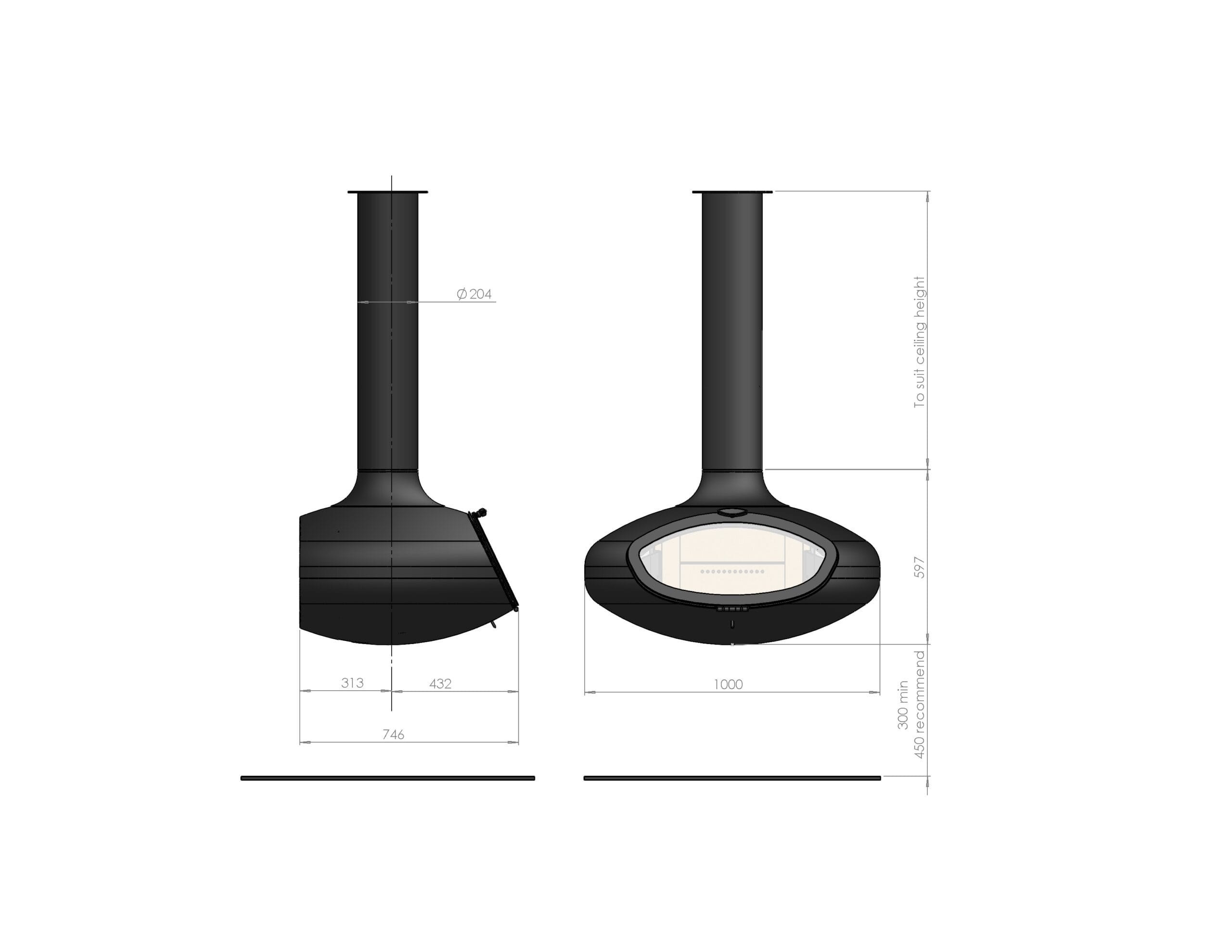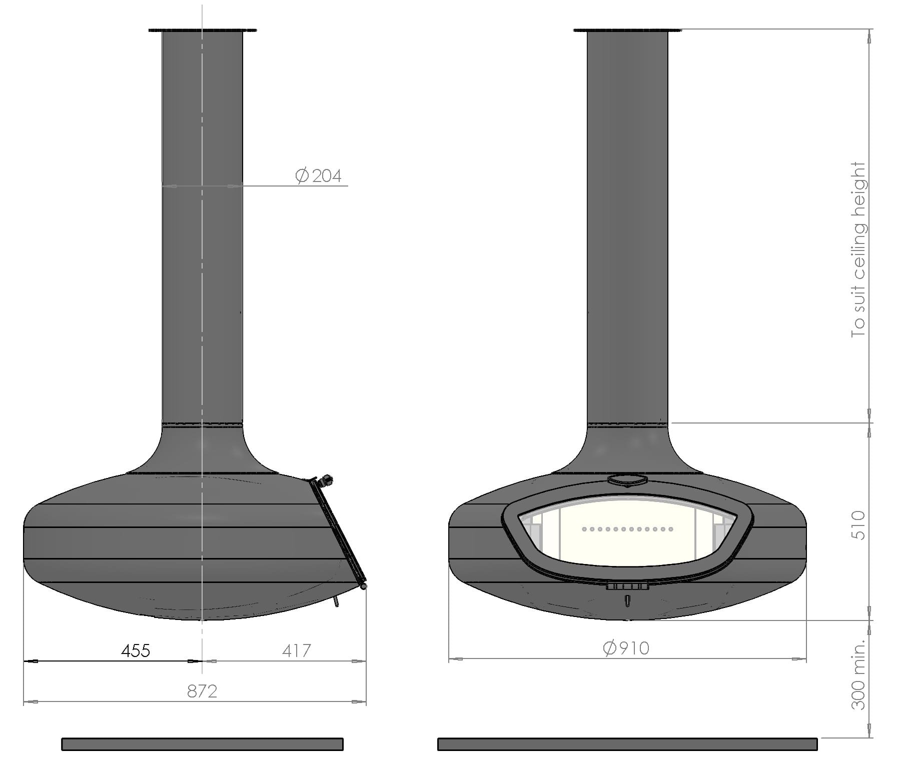 Du kan velge mellom tre forskjellige størrelser: 69cm diameter, 90cm diameter, 100cm diameter og flere fargealternativer, slik at du kan skreddersy din unike hengende vedovn etter dine egne preferanser. Designet inkluderer også en 360° rotasjonsfunksjon, slik at du enkelt kan justere ovnen etter rommets utforming og dine behov.