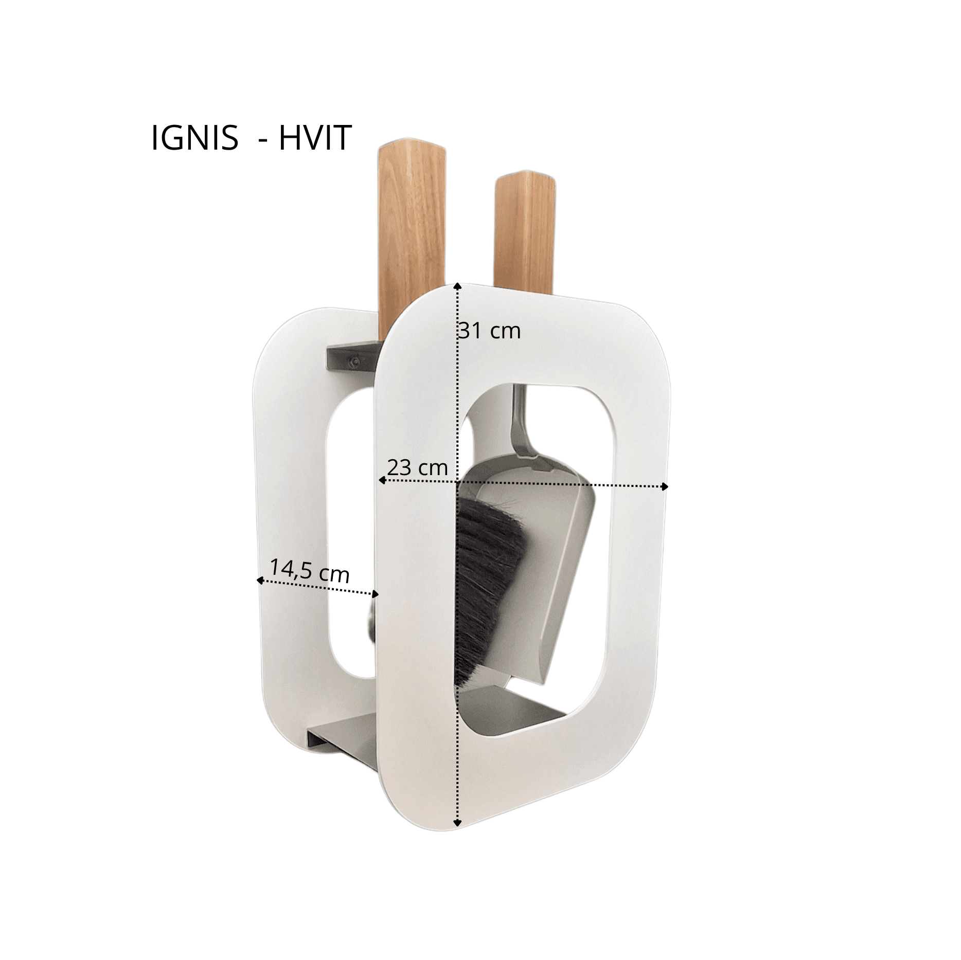 IGNIS –  er et kompakt, moderne peissett som kombinerer minimalistisk design med høy funksjonalitet. Settet består av en kost og en askespade, elegant plassert i en stilren ramme av stål med hvit finish. Håndtakene i naturtre gir et varmt, nordisk preg og sikrer godt grep under bruk.