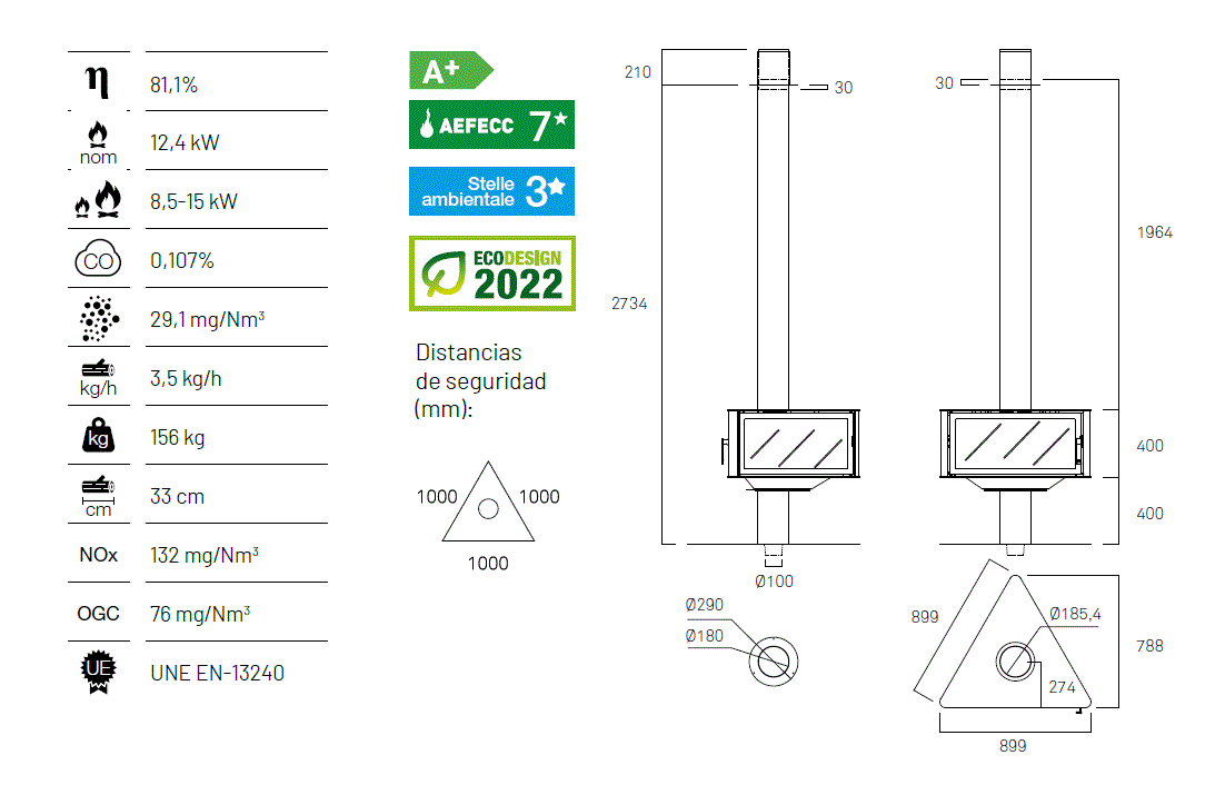 Den lukkede brennkammerløsningen sikrer effektiv og trygg forbrenning, mens toppmontert røykrør gir fleksibel installasjon.