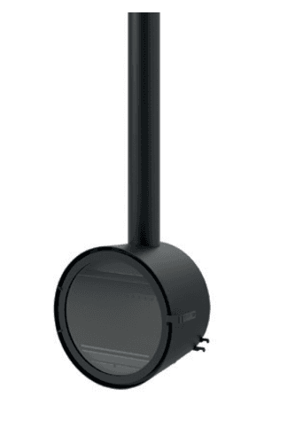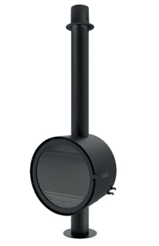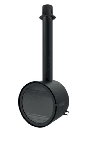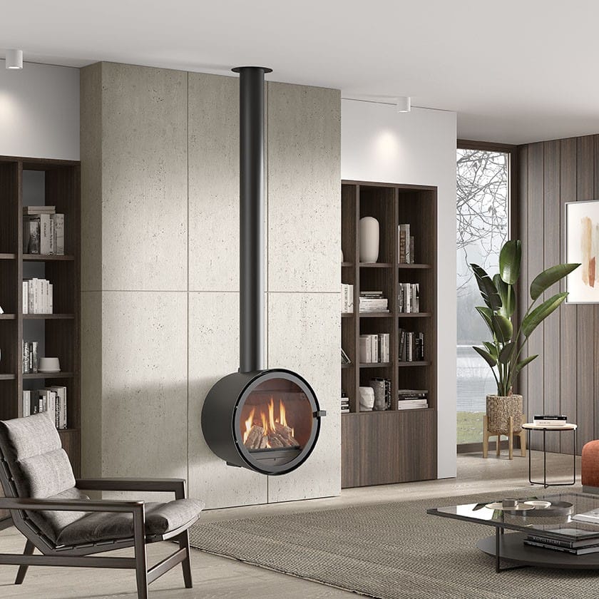 En moderne, rund vedovn som monteres direkte på vegg og gir rommet et eksklusivt og arkitektonisk uttrykk. Den svevende installasjonen skaper et lett og elegant preg, samtidig som flammene står i sentrum.