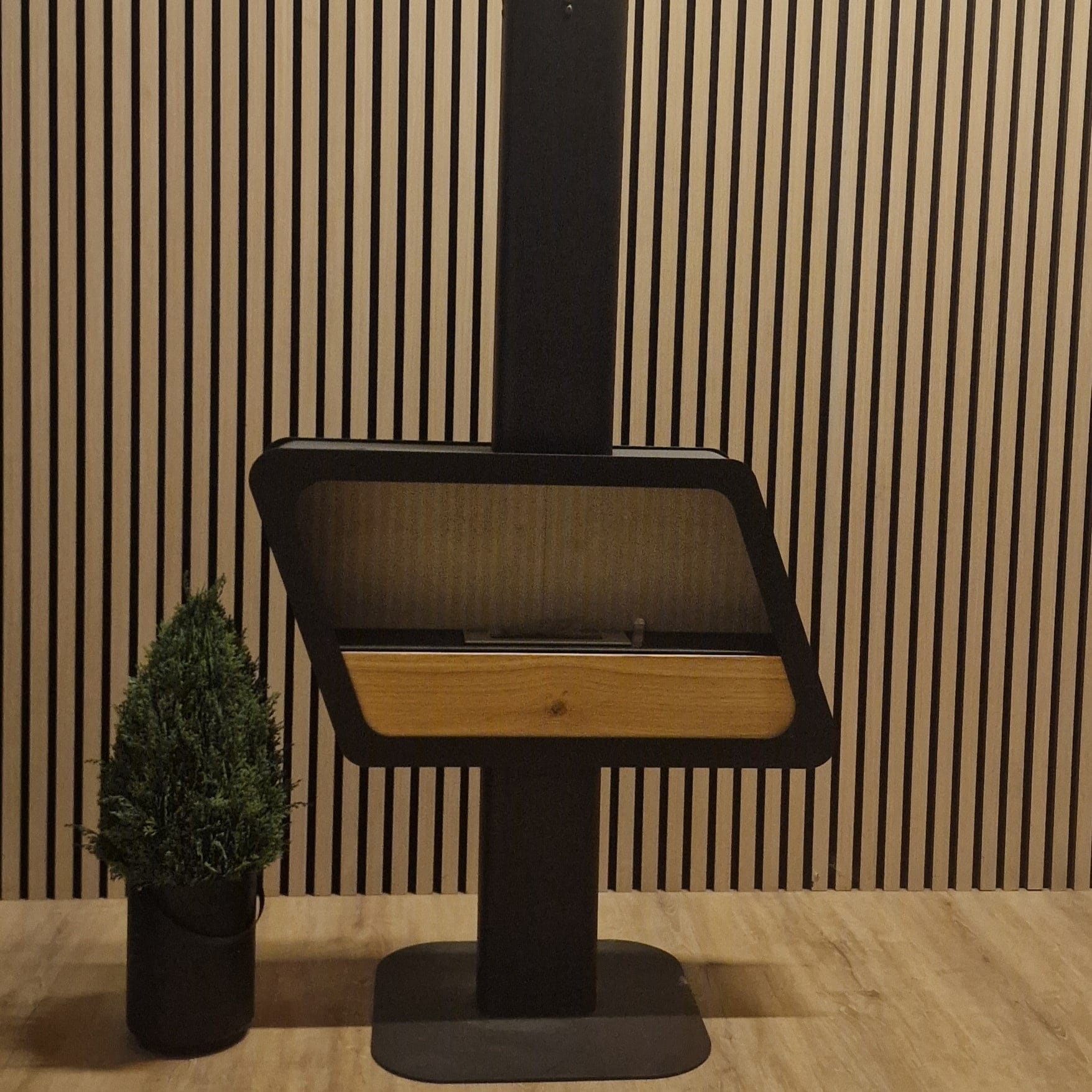 Denne stilrene frittstående peisen kombinerer moderne design med varme detaljer. Den står på en solid sokkel og søyle, og har en elegant, avrundet ramme som gir et mykt uttrykk. Frontpanelet i treimitasjon tilfører en naturlig kontrast til den svarte stålkonstruksjonen – perfekt for både hjem og kommersielle miljøer som kontorer, hoteller og showrom.